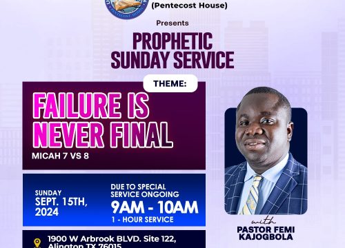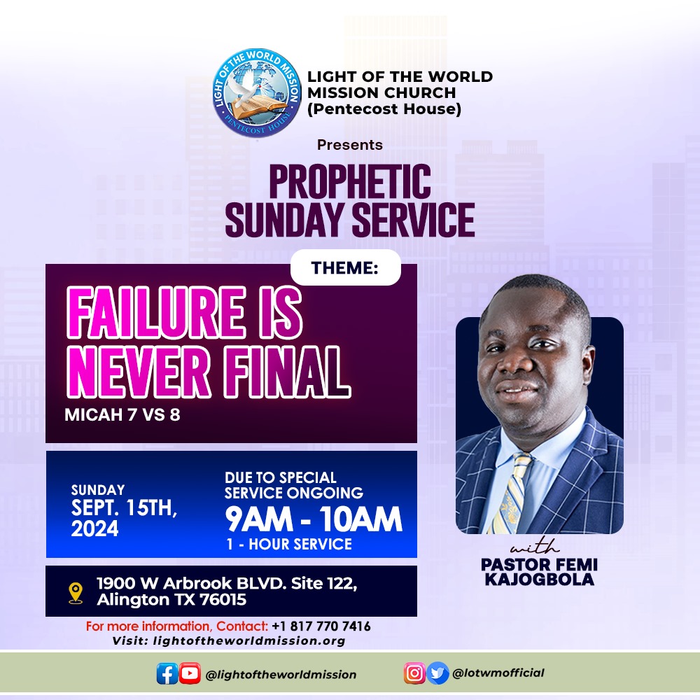 Join us this coming Sunday for Prophetic Sunday Service THEME: FAILURE IS NEVER FINAL 📅 15TH SEPTEMBER, 2024 🕐 9:00AM-10:00AM…