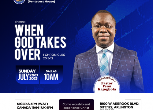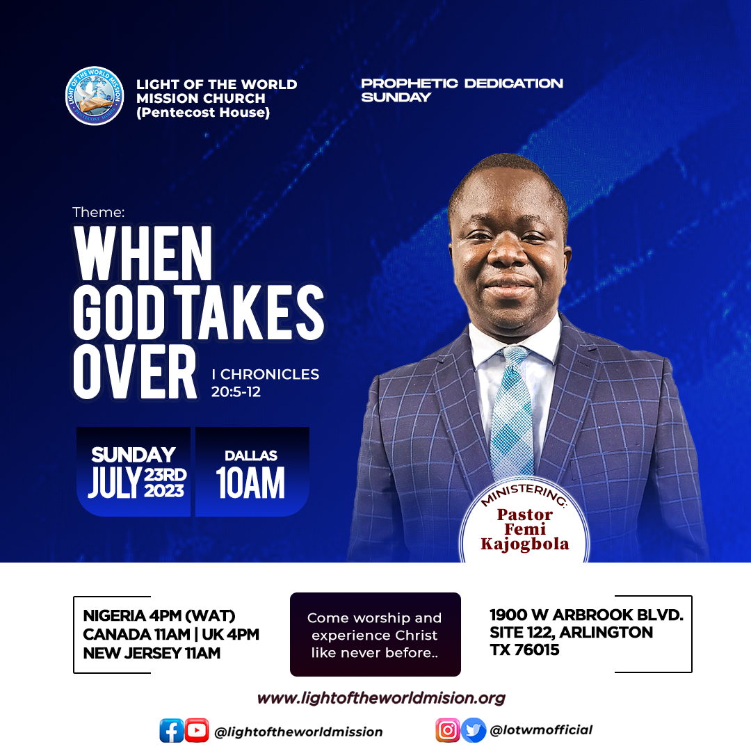 Join us this coming SundayProphetic Dedication Sunday (JULY) THEME: WHEN GOD TAKES OVER 📅 23RD JULY, 2023Time: 10:00AM (Dallas, Texas)…