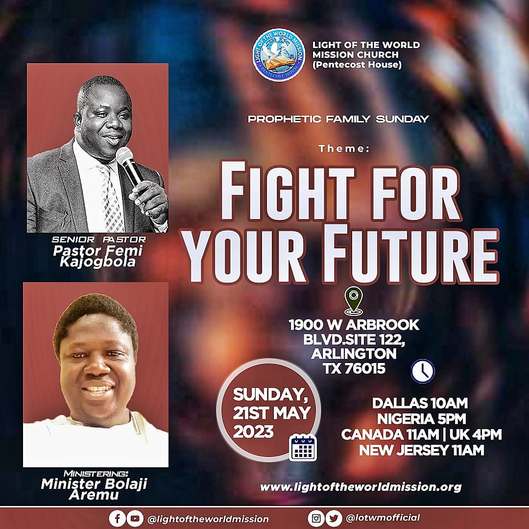 Join us this Sunday for Prophetic Family Sunday (May 2023) THEME: FIGHT FOR YOUR FUTURE 📅 21ST MAY, 2023Time: 10:00AM…