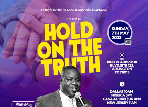 Join us on the first Sunday of the Month of MAY.(Prophetic Thanksgiving Sunday Service) THEME: HOLD ON THE TRUTH đź“……