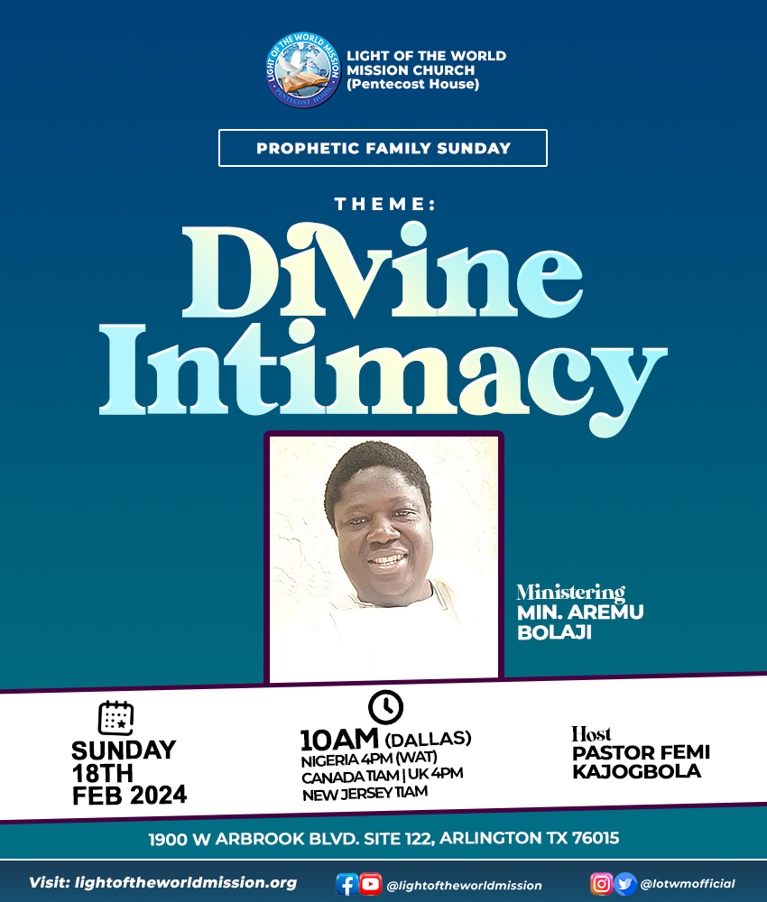 Join us this coming Sunday for a powerful service THEME: DIVINE INTIMACY 📅 18TH FEBRUARY, 2024🕐 10:00AM (Dallas, Texas)📍1900 W…