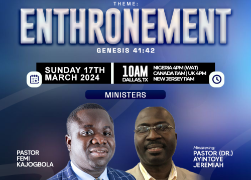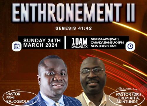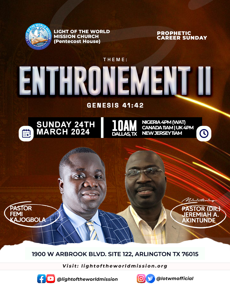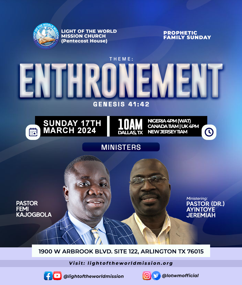 Join us this coming Sunday for a powerful service THEME: ENTHRONEMENT II 📅 24TH MARCH, 2024🕐 10:00AM (Dallas, Texas)📍1900 W…