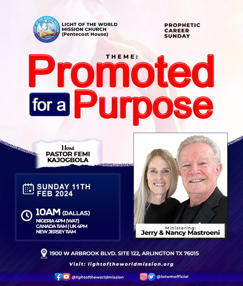 Join us this coming Sunday for a powerful service THEME: PROMOTED FOR A PURPOSE π 11TH FEBRUARY, 2024π 10:00AM (Dallas,…
